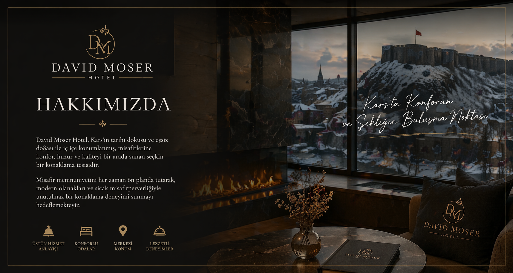 David Moser Hotel olarak amacımız; misafirlerimize sadece bir konaklama değil, aynı zamanda kaliteli ve özel bir deneyim sunmaktır. Sizleri Kars’ın büyüleyici atmosferinde ağırlamaktan mutluluk duyarız.